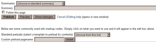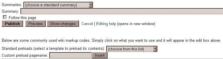- Where it says "Custom preload pagename", enter the title of a page in the box to load all the text on that page into the page you are editing. You will probably very rarely, if not even use this button.