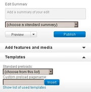 - Where it says "Standard preloads", you can click where it says "(click to browse)" to pull down a list of templates. Clicking on one of them will place it on the page you are editing, rather than having to find a page that has the template.